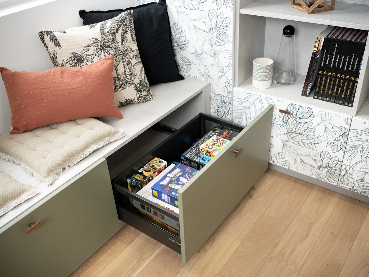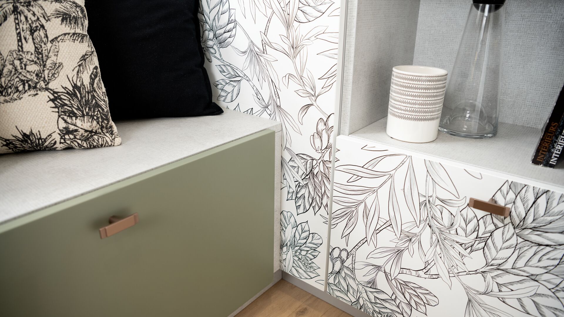 Bij het inrichten van hun interieur wilde het stel veertigers een ruimte creëren met een bureau en boekenkast, gescheiden van de keuken en woonkamer. De collectie “Botanic Print” viel bij hen bijzonder in de smaak vanwege de modulariteit en de mogelijkheid om een wand te creëren. De boekenkast met open gedeeltes bakent de verschillende leefruimtes goed af. Daarbij beschikt meneer over voldoende ruimte om zijn boeken op te bergen en is er plek om verhalen voor te lezen aan zijn zoontje waarbij plaats kan worden genomen op de bank. De werkhoek moest designvol en functioneel zijn. Met het meubel met wieltjes en de goed uitgedachte verlichting is de opdracht absoluut geslaagd!