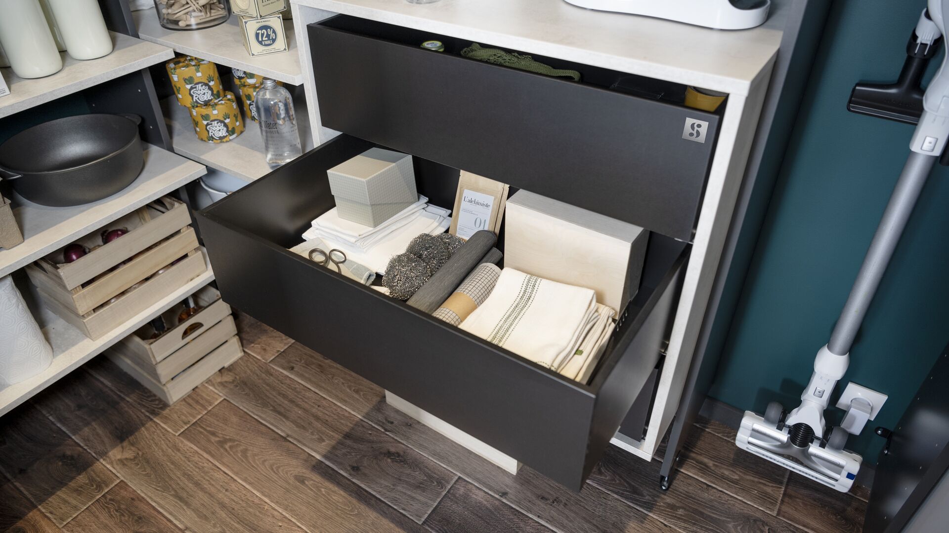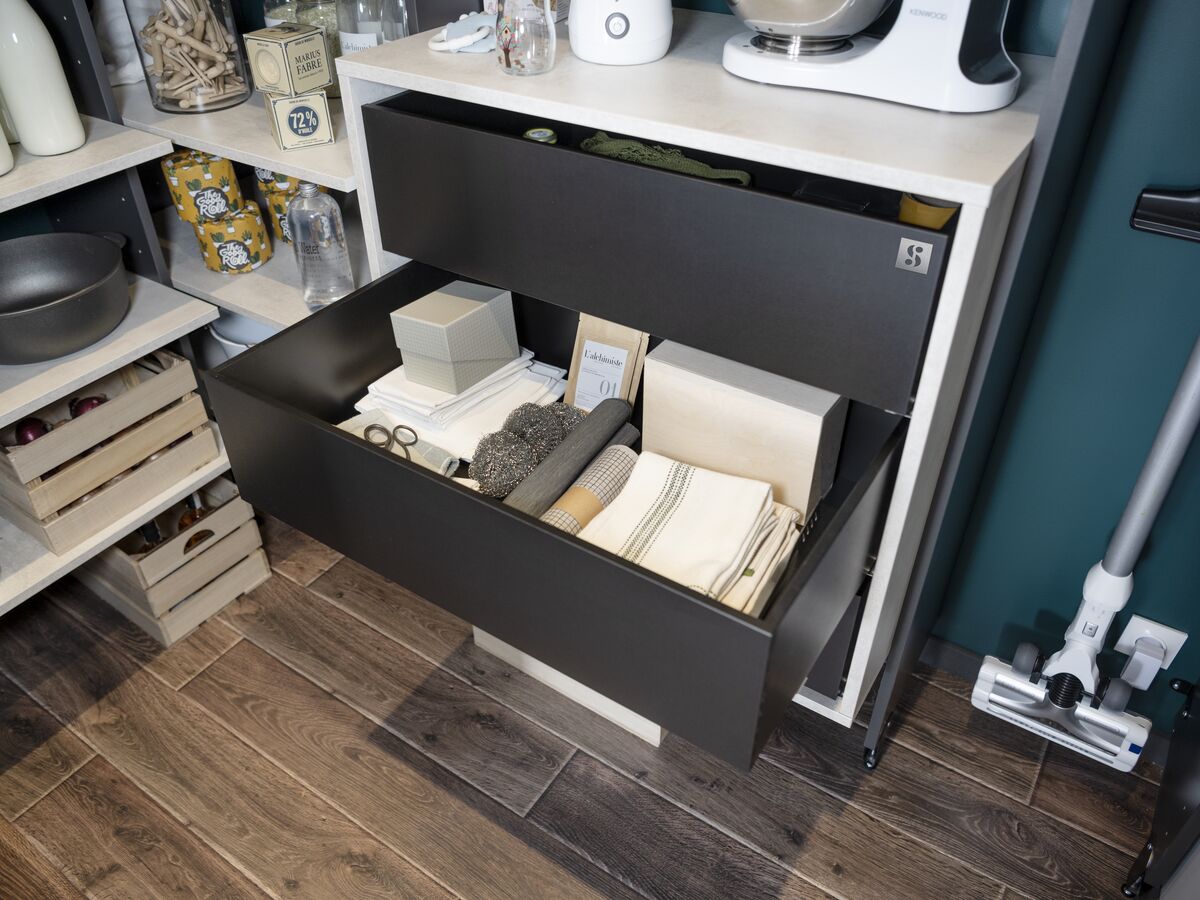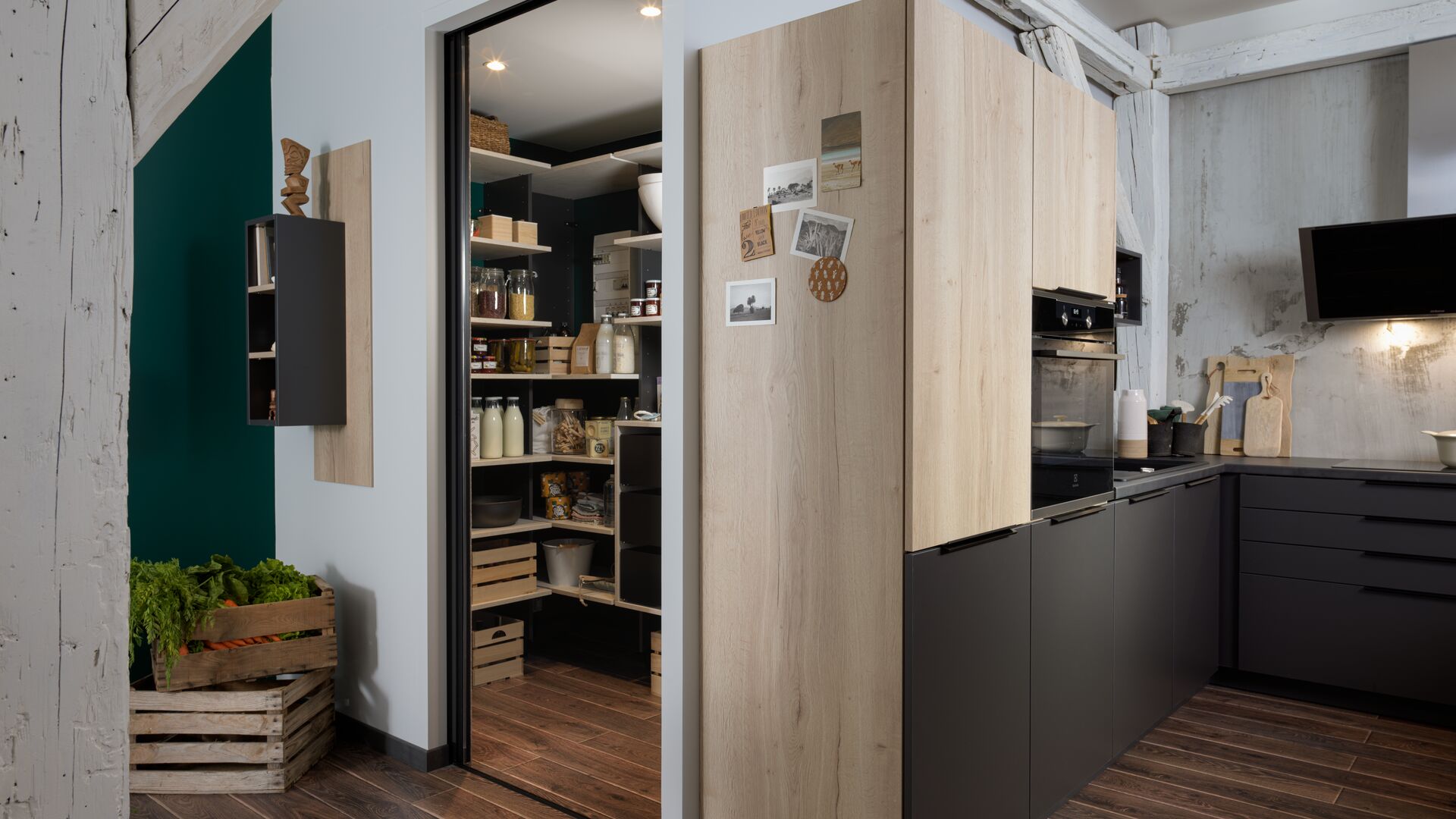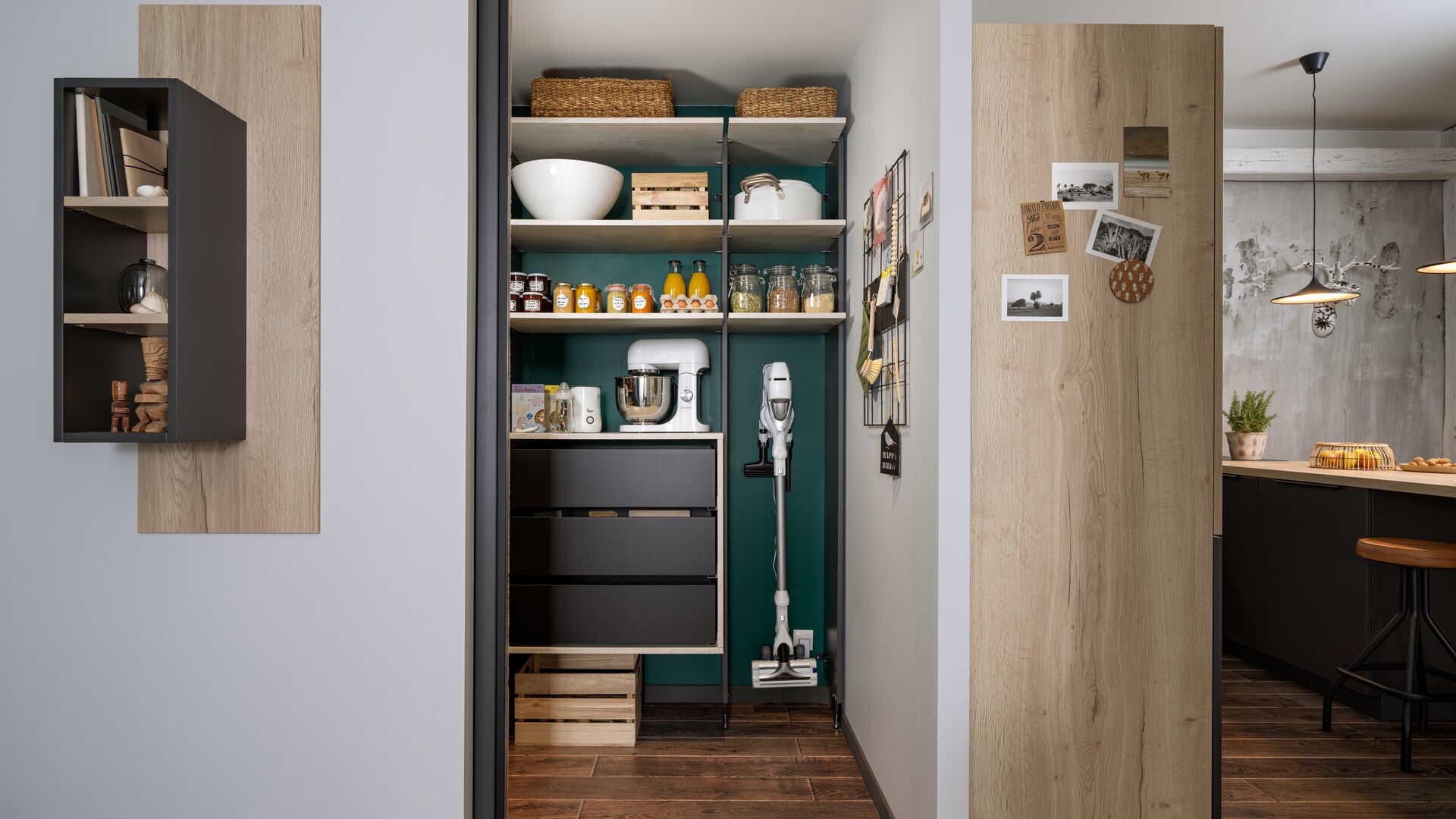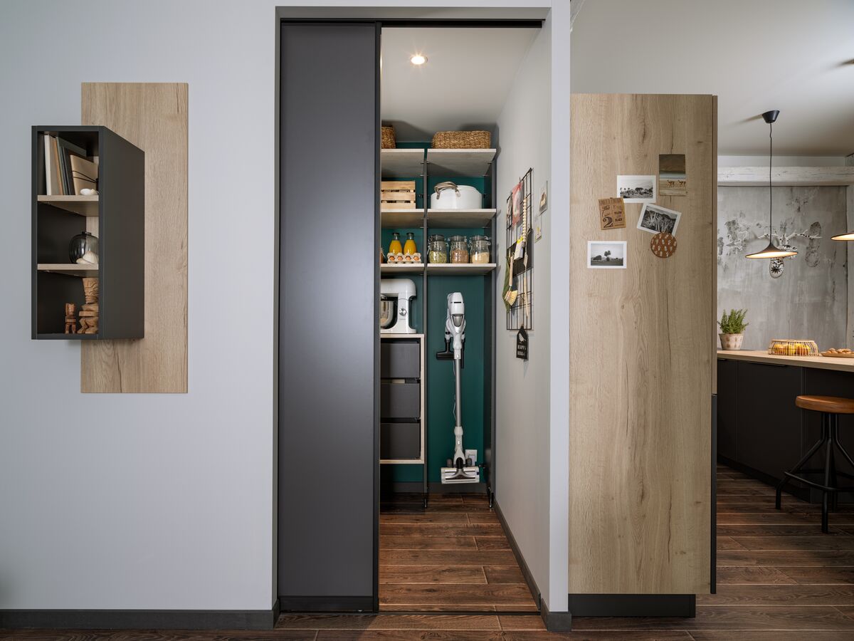 Uw interieur organiseren was nog nooit zo eenvoudig en plezierig als met de vele opbergmogelijkheden van deze voorraadkast op maat. En dat komt goed uit, want met een klein kind konden Sophie en Paul wel een goede opbergoplossing gebruiken! Deze jonge ouders hebben hun provisiekast expres in hun keuken geplaatst, omdat ze er niet alleen hun keukengerei en -apparatuur in opbergen. Het voordeel van deze provisiekast met diverse meubelen en schappen, is dat ze nu over een geoptimaliseerde en vooral veelzijdige opbergruimte beschikken om hun dagelijks leven te organiseren.