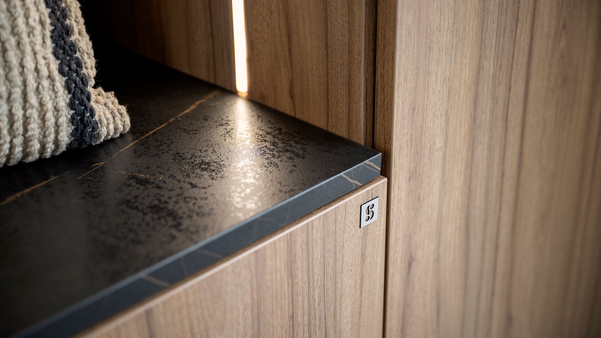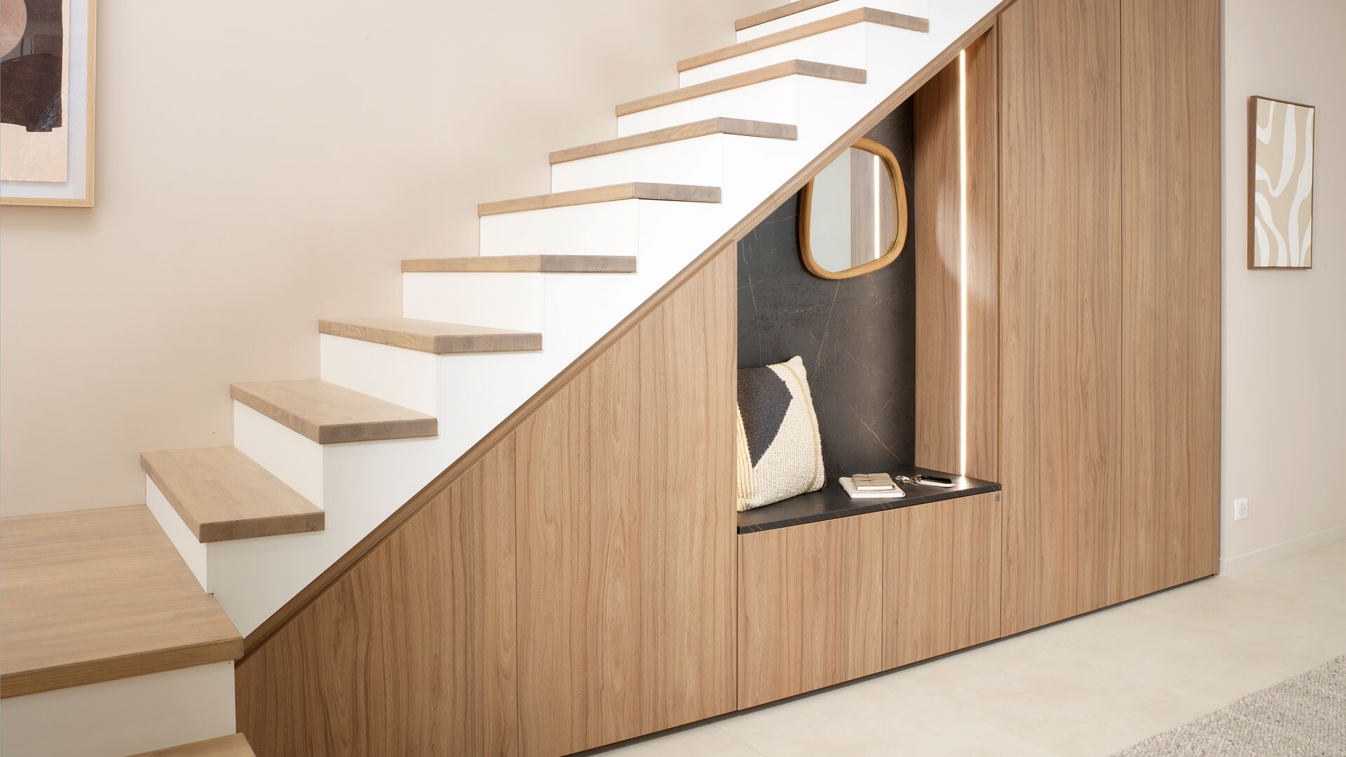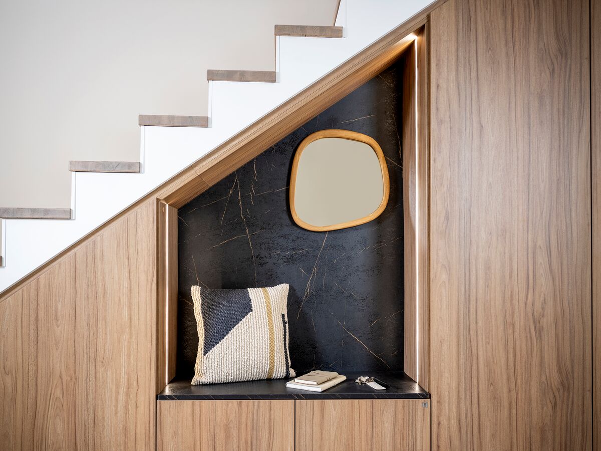 Om de structuur lichter te maken en visuele rust te brengen, opent zich in het midden een eenvoudige, centrale nis. Een echte decoratieve pauze die zorgvuldig gekozen accessoires in de kijker zet – met textuur, licht en contrast.