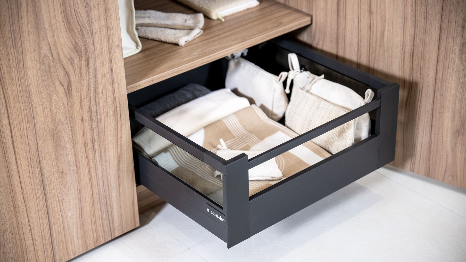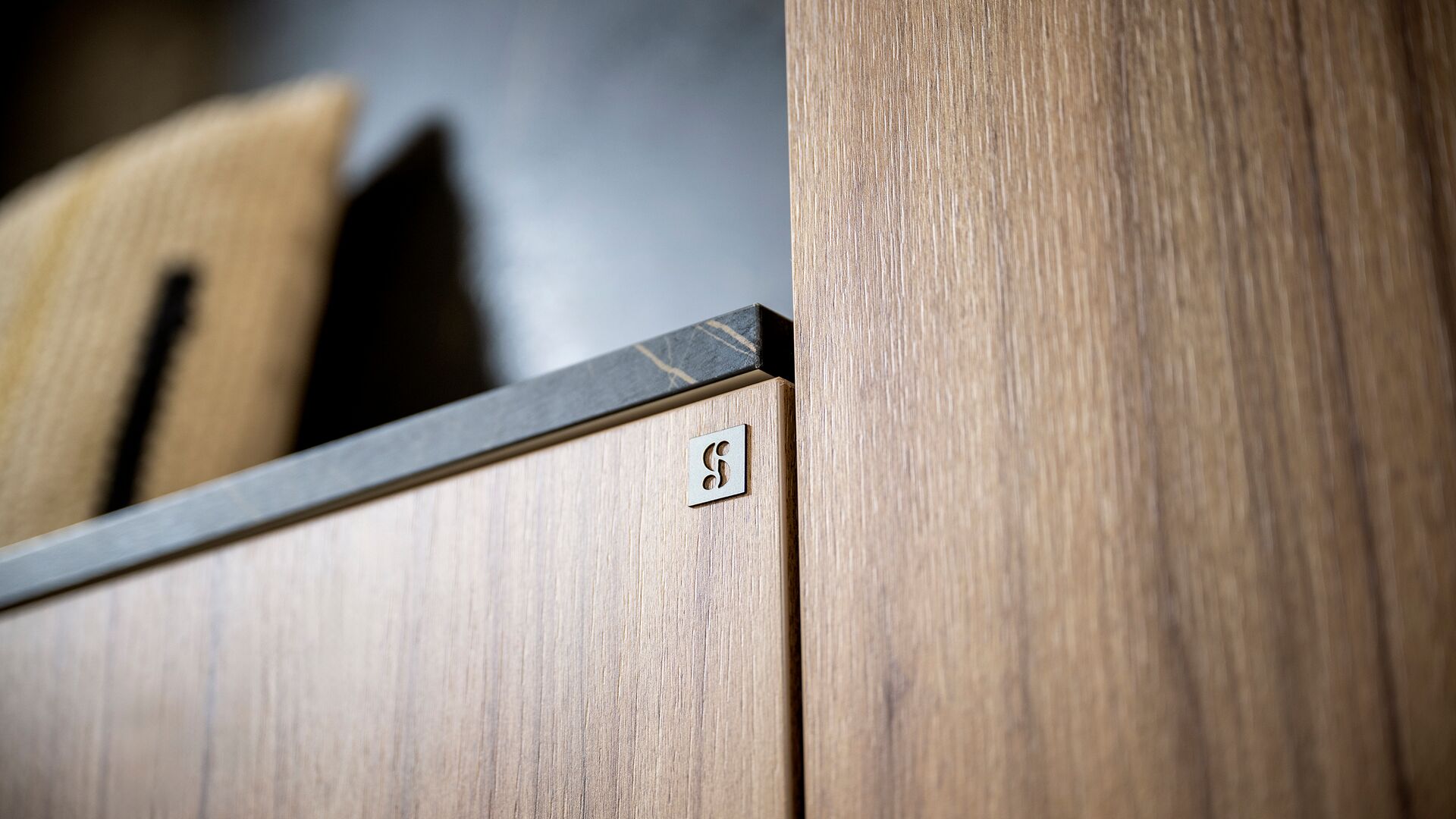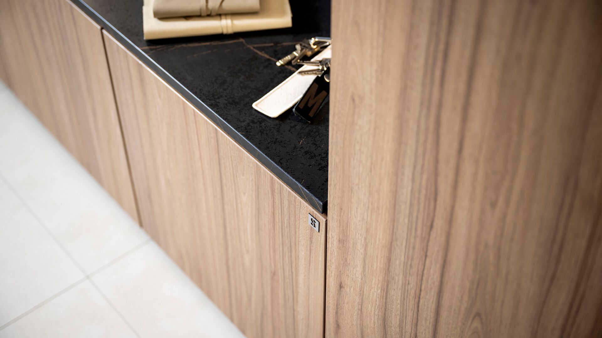 Om de structuur lichter te maken en visuele rust te brengen, opent zich in het midden een eenvoudige, centrale nis. Een echte decoratieve pauze die zorgvuldig gekozen accessoires in de kijker zet – met textuur, licht en contrast.