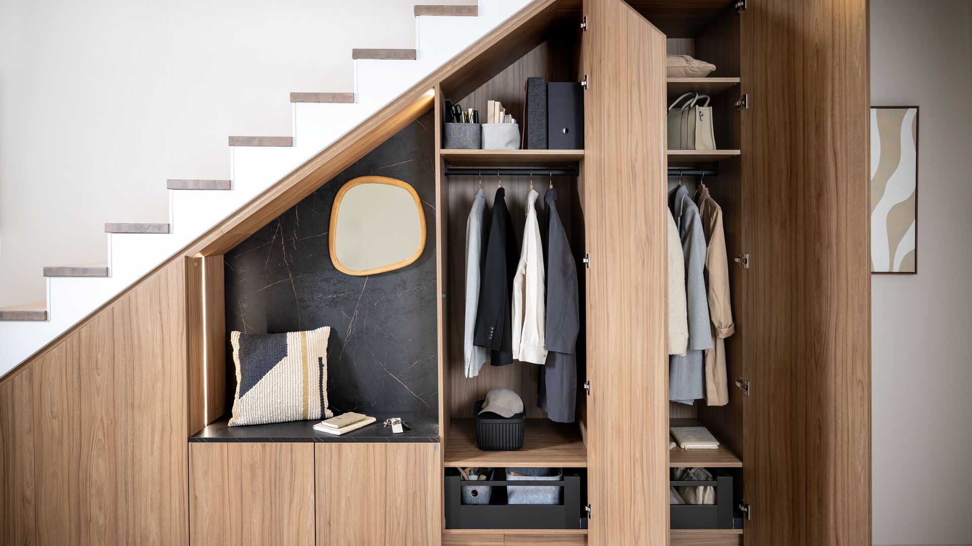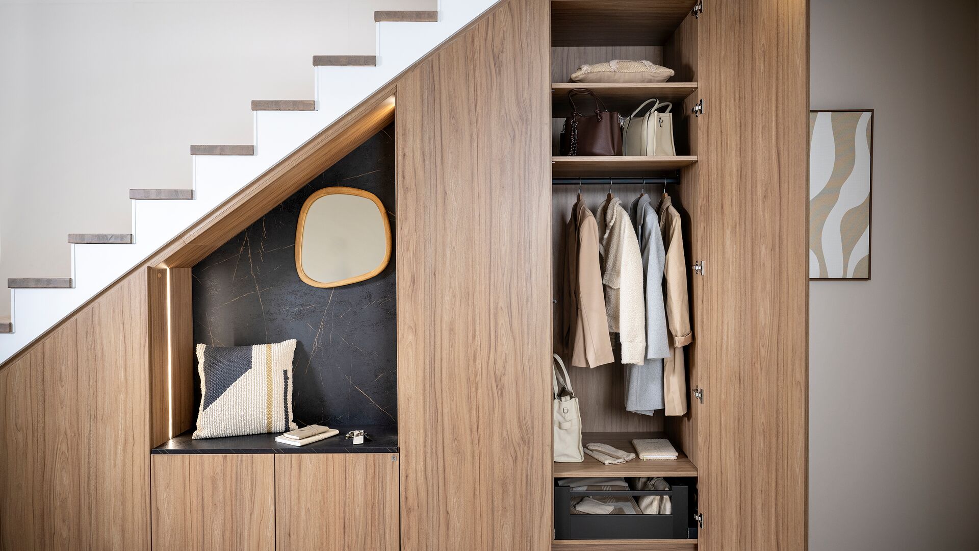 Onder deze trap is elke centimeter benut als een kans. Deze maatwerkkast voor de entree illustreert perfect de kunst om ongewone ruimtes optimaal te gebruiken zonder aan esthetiek in te boeten. Met zijn royale diepte biedt hij een praktische en doordachte indeling: een garderobe voor jassen en mantels, discrete opbergruimtes voor dagelijkse spullen en zelfs plek om grote apparaten netjes te verbergen.