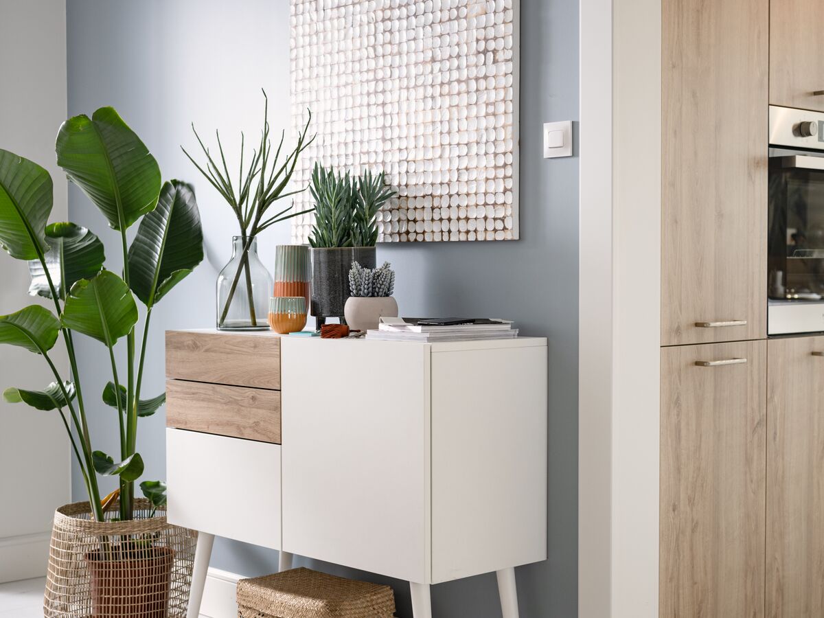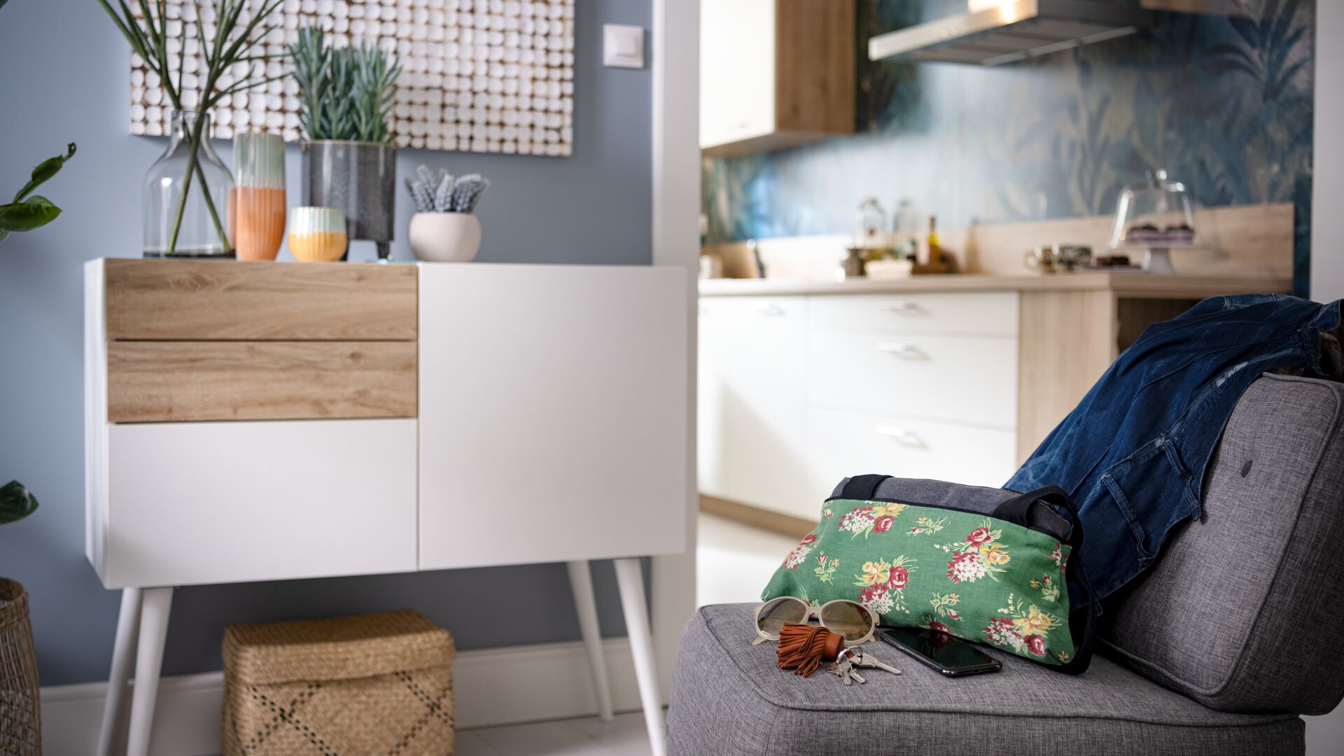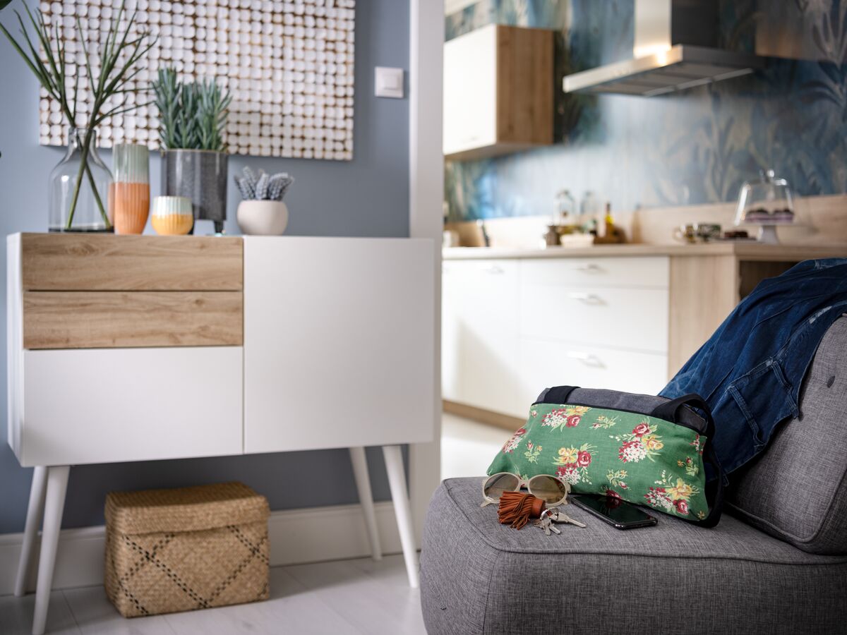 Telkens als Marjolein thuiskomt, zegt ze tegen zichzelf dat het echt een goed idee was om dit entreemeubel aan te schaffen. Dit meubel heeft een Scandinavische stijl waar ze erg veel van houdt en blijkt bovendien zeer praktisch te zijn. Als de jonge stadsvrouw haar woning binnenkomt, legt ze haar sleutels en zonnebril erop. Haar dochter - die er om de week is - ruimt haar rugtas erin op. En wat ze het meest waardeert is dat deze kleine en multifunctionele design commode prachtig bij haar keuken die er vlak naast ligt, past!