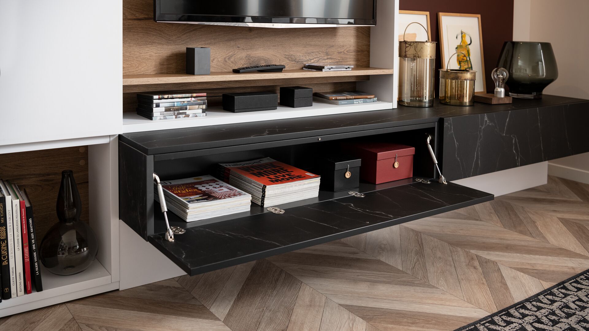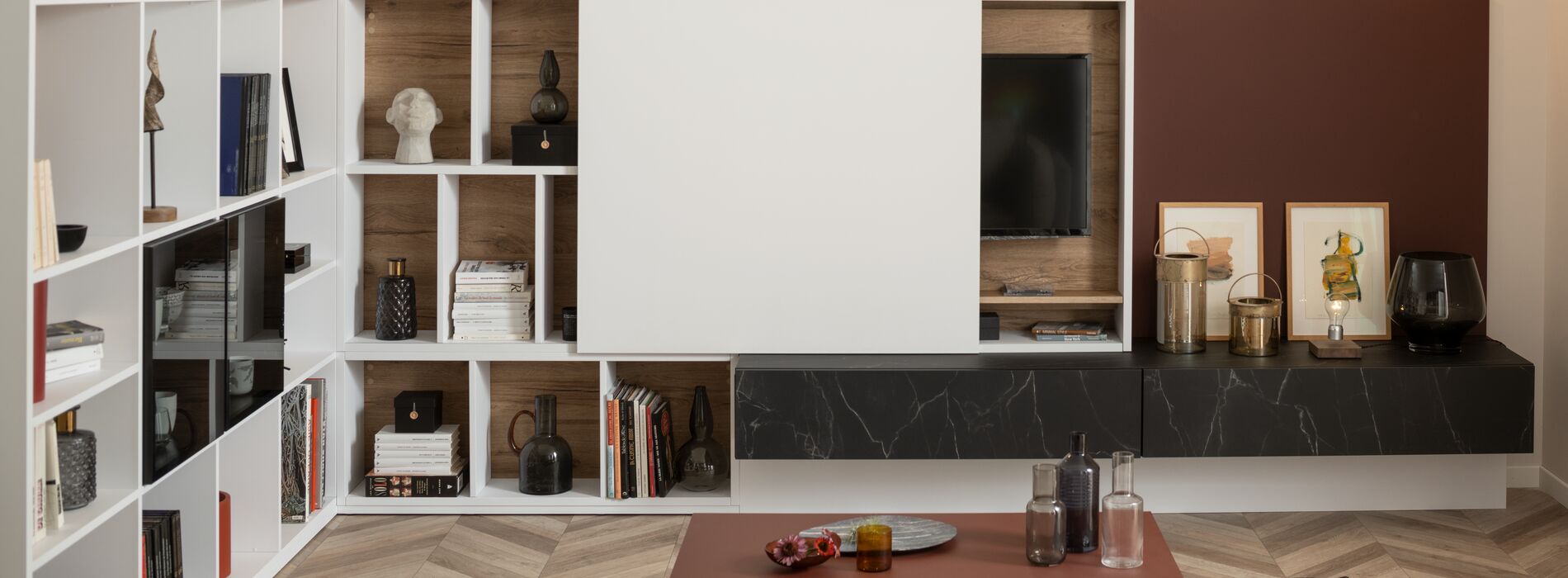 Dennis en Victoria wilden in hun grote woonkamer ruimtes afbakenen om zones te creƫren voor het eet- en woonkamergedeelte, zonder muren toe te voegen. Het stel heeft de oplossing gevonden met dit boekenkast/TV-meubel dat volledig aan hun verwachtingen voldoet. Er is niet alleen een scheiding met open structuur ontstaan, maar ze kunnen tevens gebruikmaken van verschillende open en dichte vakken waarin ze hun boeken kunnen opbergen of een plekje kunnen vinden voor hun decoratieve voorwerpen. Het pluspunt waar ze voor gevallen zijn? Het schuifpaneel aan de voorzijde waarmee ze de mogelijkheid hebben de televisie te verbergen!