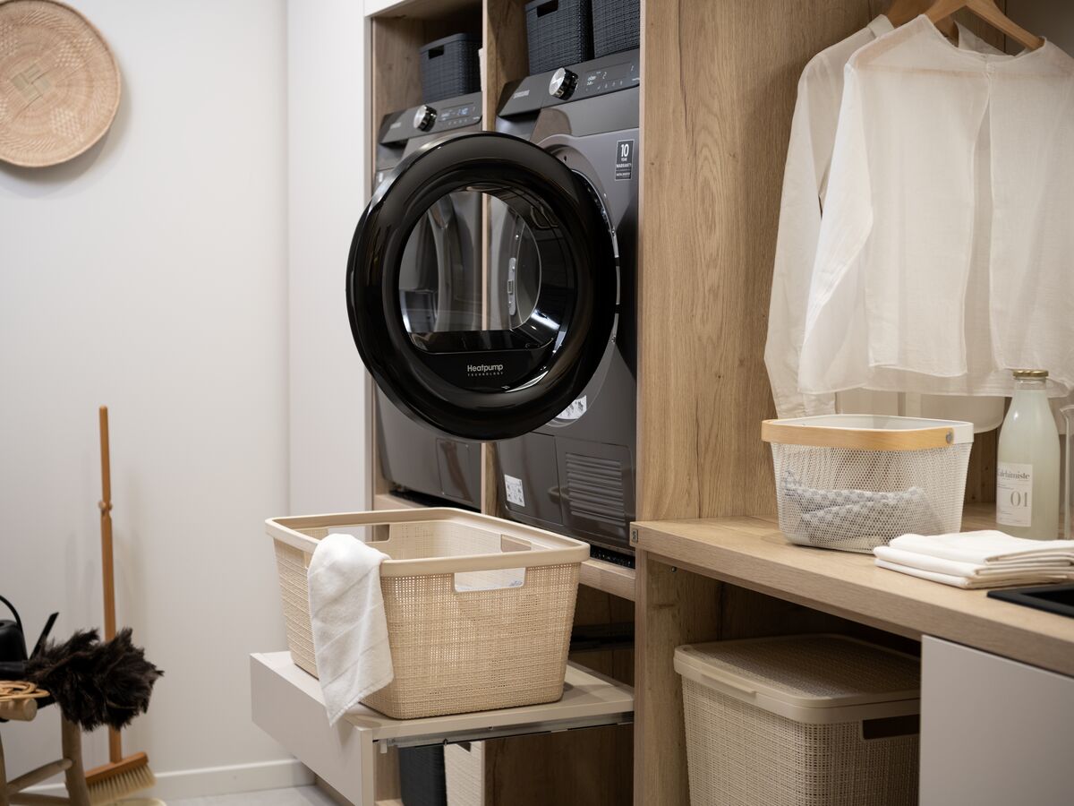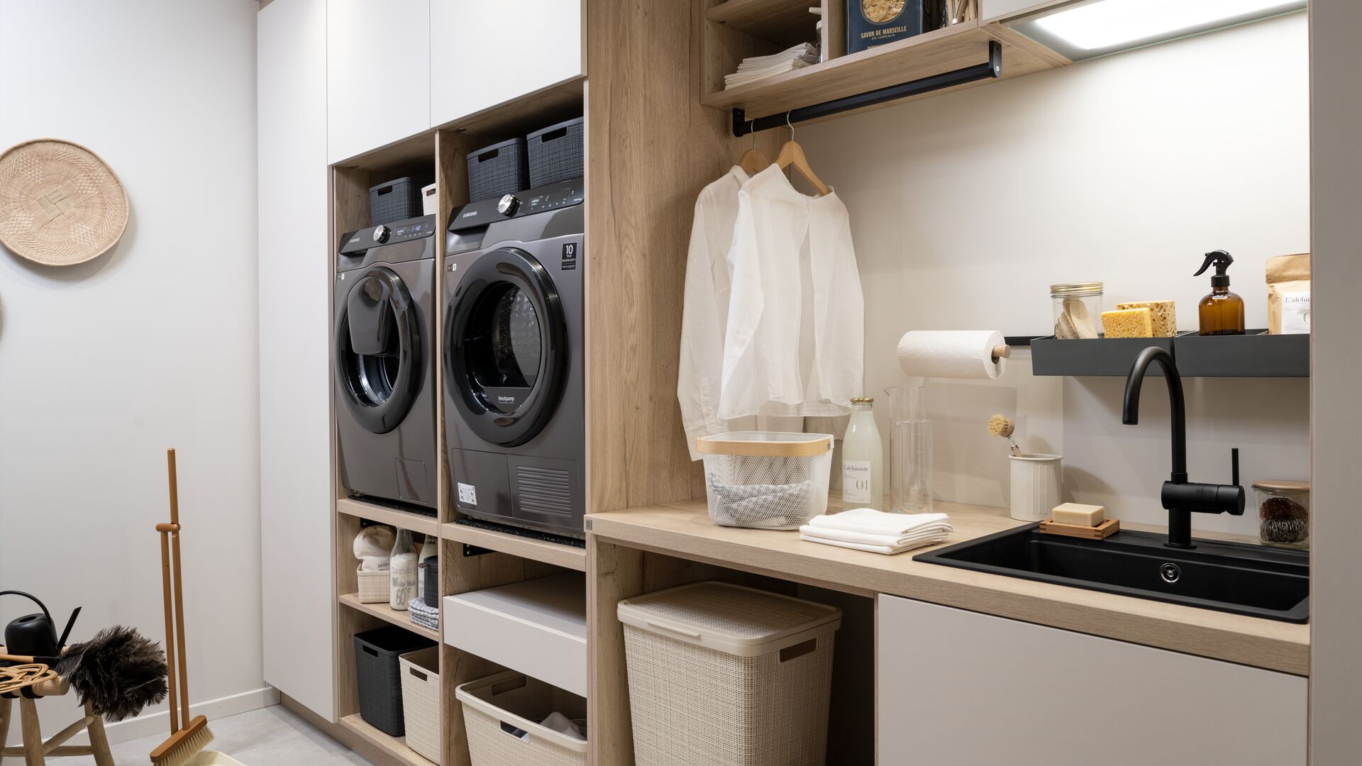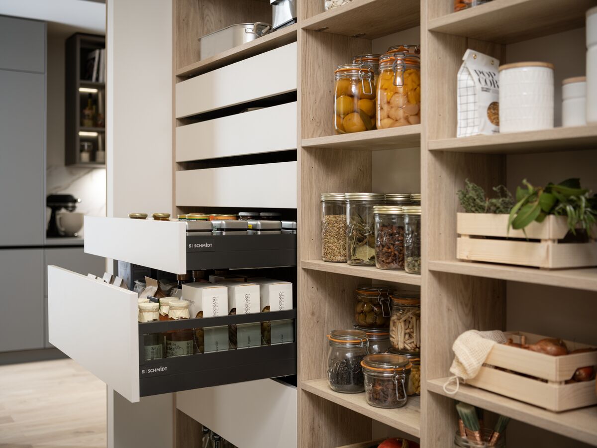"Alles op zijn plaats"... Zo willen Oscar en Anne dat hun bijkeuken ingericht wordt! Praktisch opruimen staat centraal bij dit stel, dat boven alles de voorkeur geeft aan een eenvoudige en slimme inrichting die aangepast is aan hun dagelijks leven. Aan een kant elementen om ervoor te zorgen dat de bijkeuken functioneel is en aan de andere kant meubels om alle voorraden prefect op te ruimen. Deze inrichting zorgde er trouwens voor dat het stel gekozen heeft voor dit design van Schmidt. Zachte kleuren, hoogwaardig materiaal, strakke lijnen en efficiënte opbergruimte... het recept voor een prefect uitgedachte inrichting volgens Oscar en Anne!