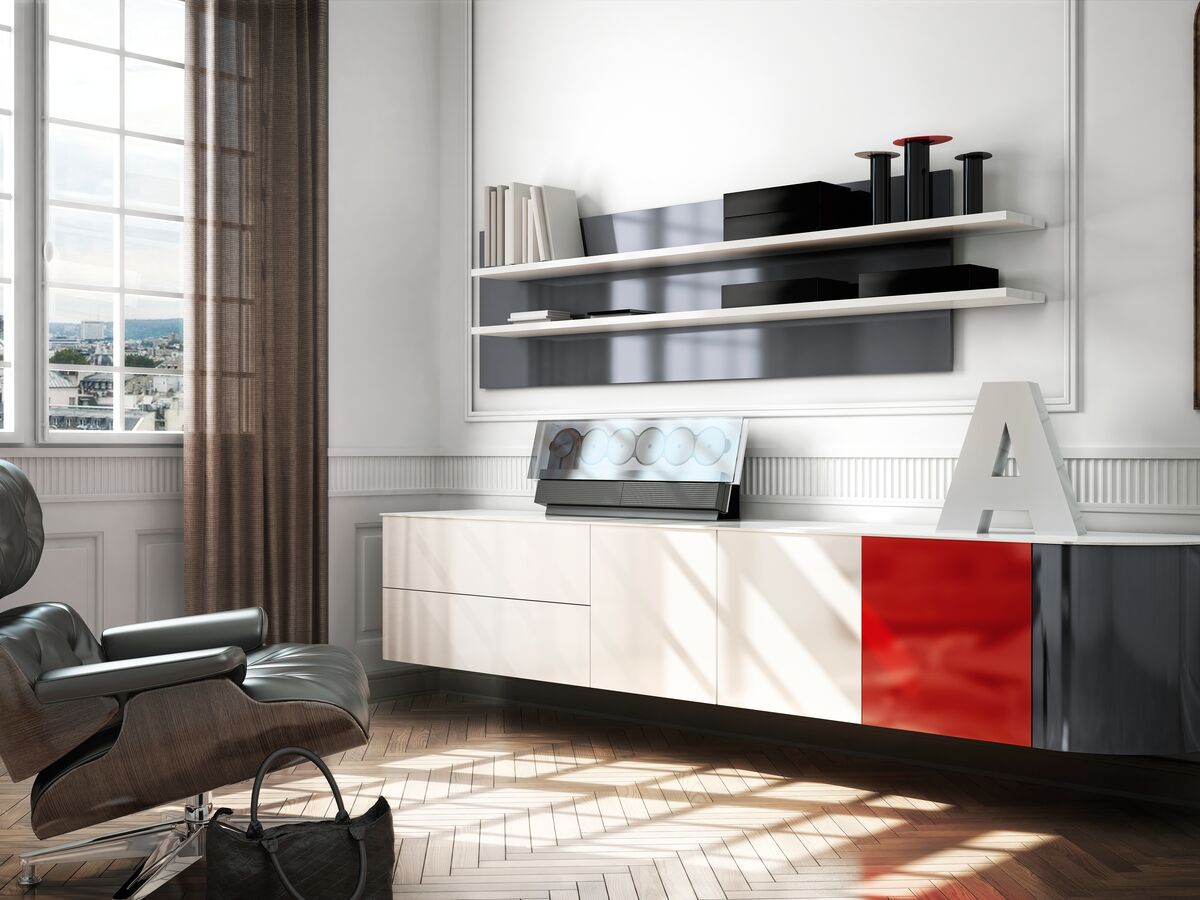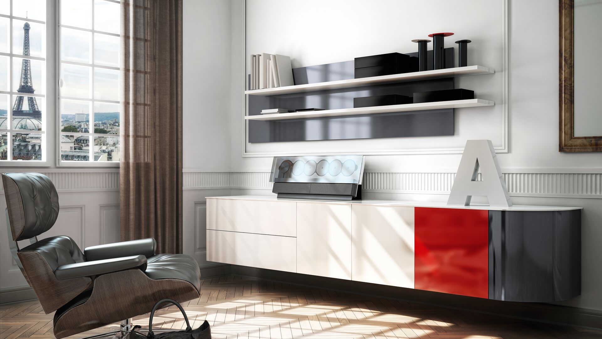 Echte luxe schuilt misschien ook gewoon in wat anders is. Deze moderne buffetkast Bombay verleent dit mooie klassieke interieur opnieuw een sterke dynamiek. De gewaagde rondingen in de afwerking contrasteren met het visgraatmotief in het parket. Het smalle ontwerp zonder handgreep accentueert het effect, versterkt door de karaktervolle keuze van de lakken: Porpora en Caneo. Zo toont u pas dat u lef hebt.