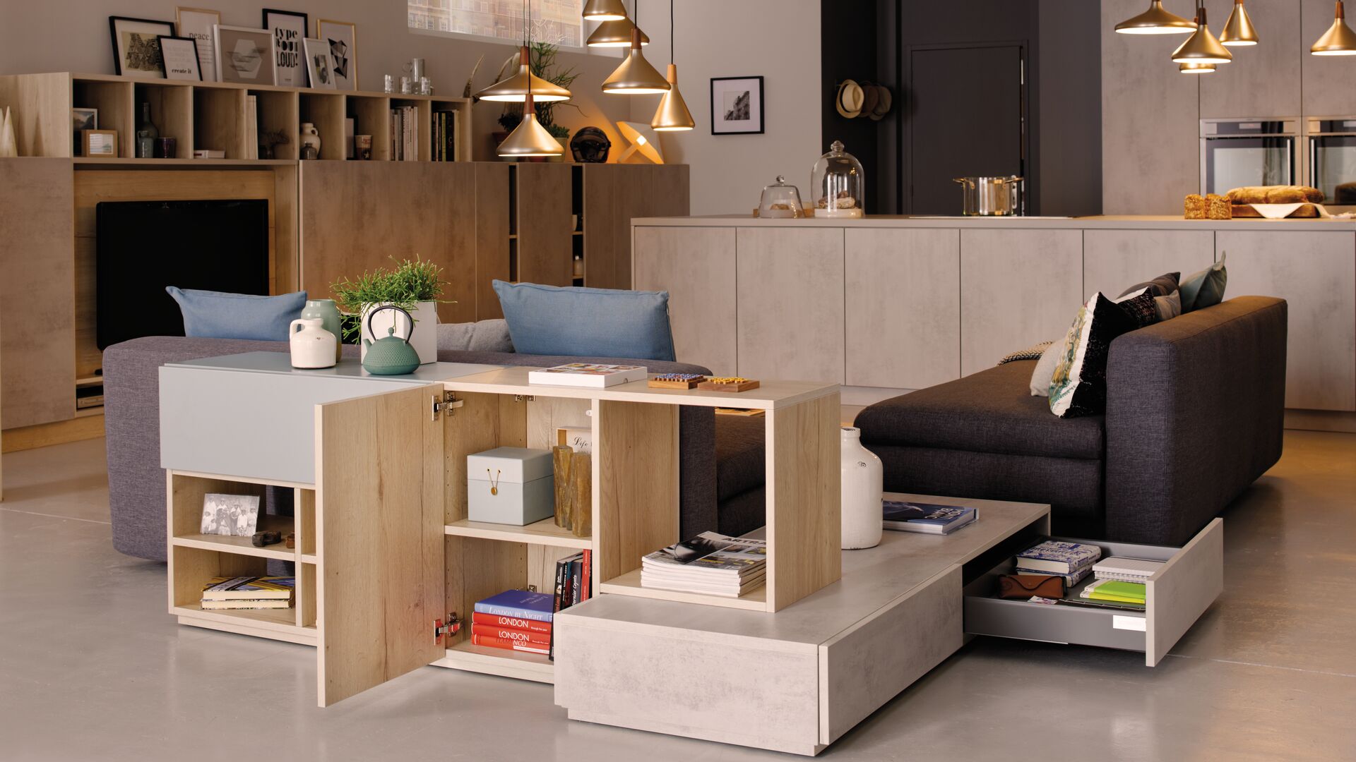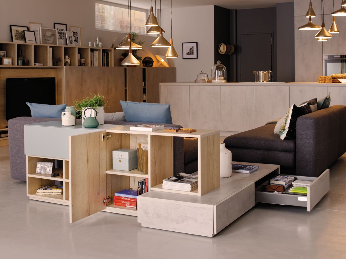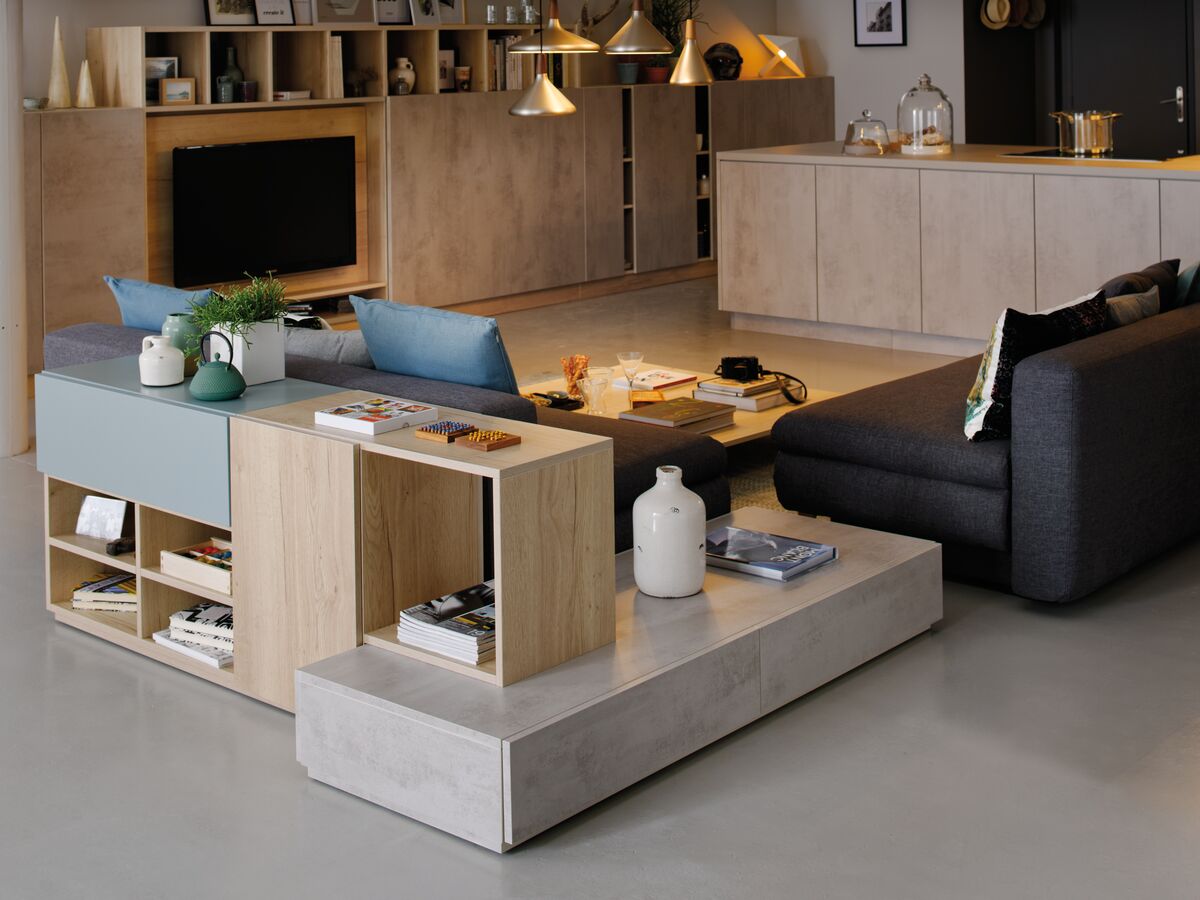 Uitstekend idee, die afgemeten hoogteverschillen in uw leefruimte. Zo hebt u hier een opstapje, daar een open boekenkast, elders een zeer georganiseerd tv-meubel. En zo stijlvol, met deze trilogie van materialen en kleuren (Harvey, Cloud en Marvel)! Het is meer dan een meubel, het is een plaats van samenkomst.