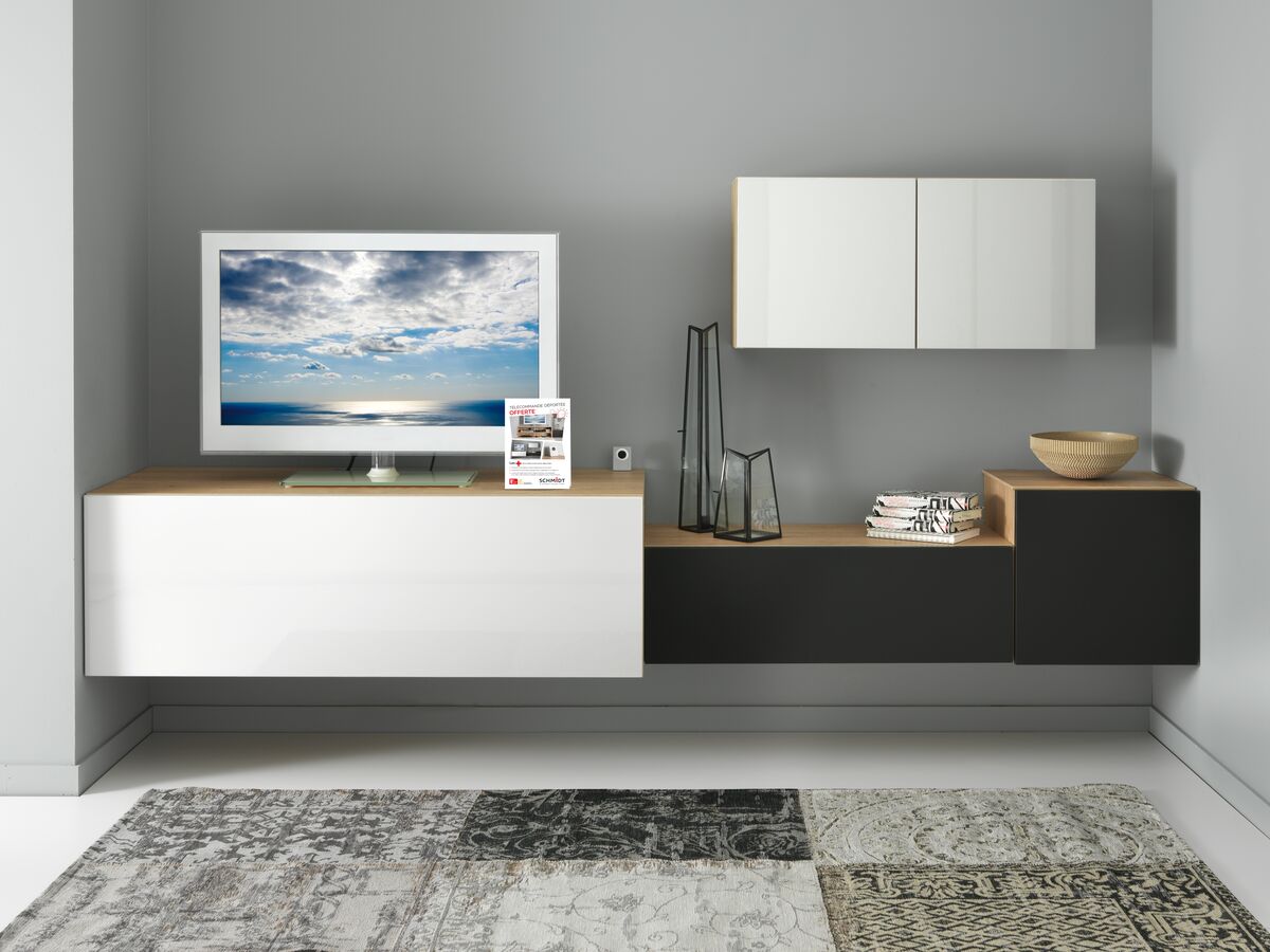 Associeer de juiste kleuren voor een prachtig samenspel: maatwerk betekent bij Schmidt ook de mogelijkheid om de kleurtinten te kiezen - zoals het Everest-wit en Nano-zwart op de houten kastjes. Stem de kleurenassociatie af op de sfeer in de gezellige TV-hoek, zonder te choqueren. En alles past tot op de millimeter tussen de twee muren van de kamer!