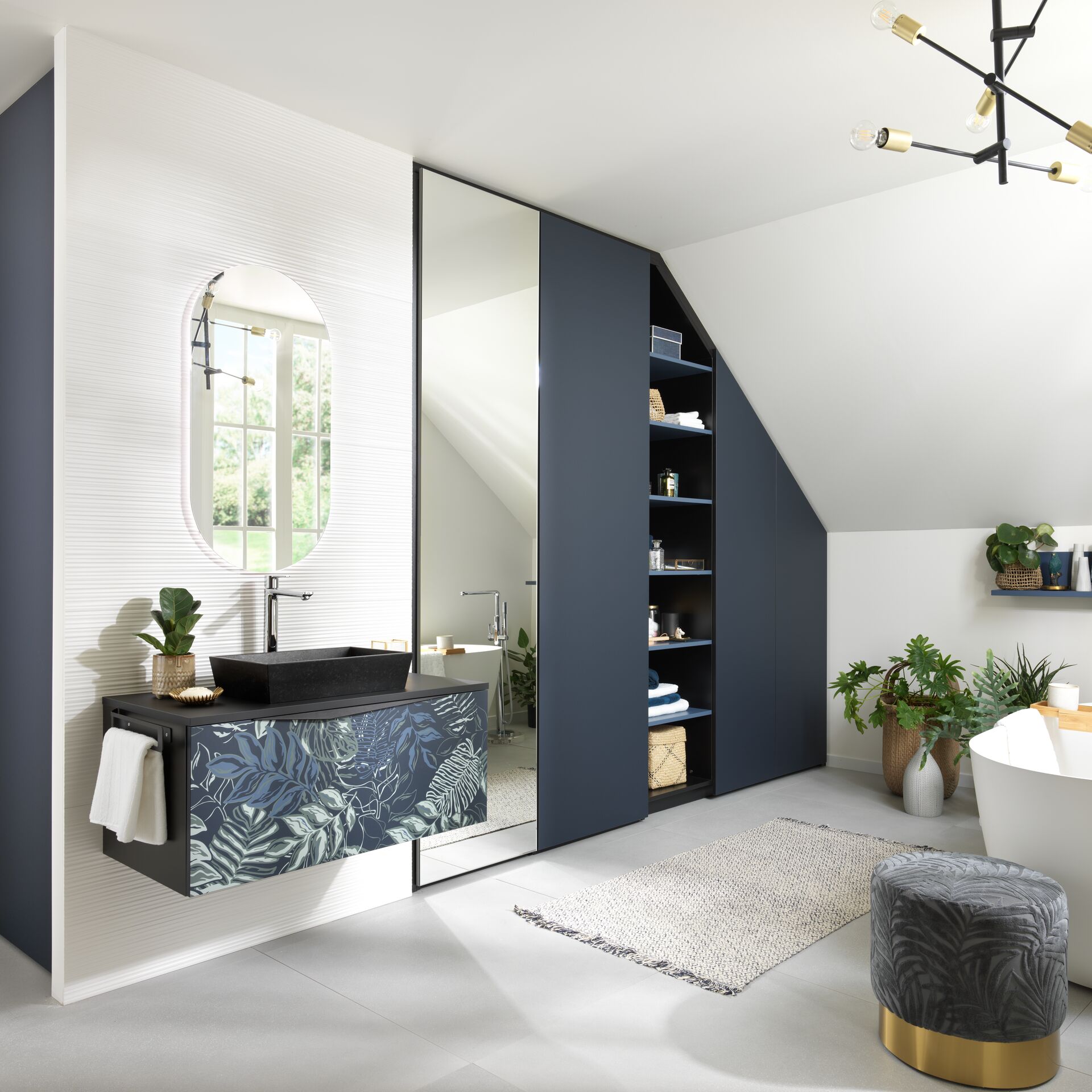 De Eolis lijn bevestigt zijn stijl in het hart van de huidige trends: kleurenprofielen (neutraal of flashy, afhankelijk van uw decoratie) worden toegevoegd aan uw meubels, volledig op maat. Alles past precies, de meubels worden discreet en zeer eenvoudig geopend. En wat een klasse, die gekleurde lijn die uw badkamer in de lengte onderstreept