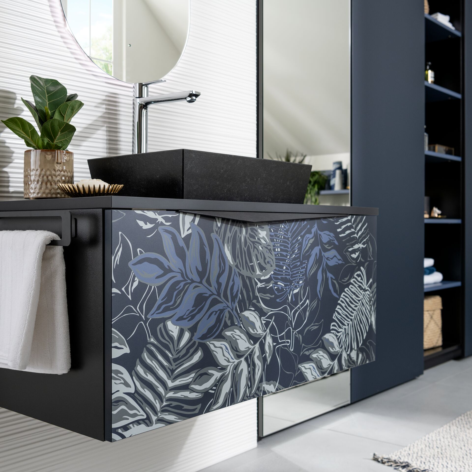 Block, Casablanca, Jungle of Art Deco: werk uw project naar wens uit en sier de fronten van uw badkamer subtiel met onze decors! Hier is het wastafelmeubel getooid met het decor Jungle!